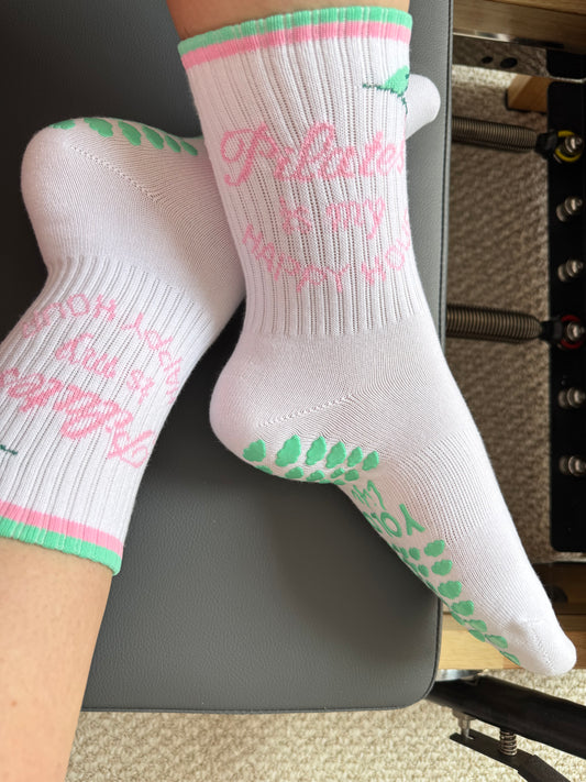 Pilates Grip Socks – “Pilates Is My Happy Hour” Design | Non-Slip Mint & Pink for Women