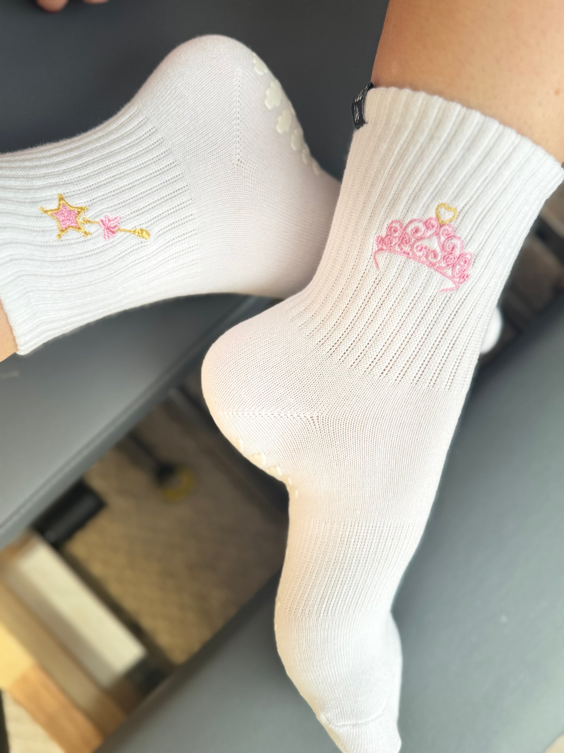 White ribbed Pilates grip socks featuring double-sided embroidery — a witch hat, tiara, broom, and magic wand — symbolizing balance between grace and power.